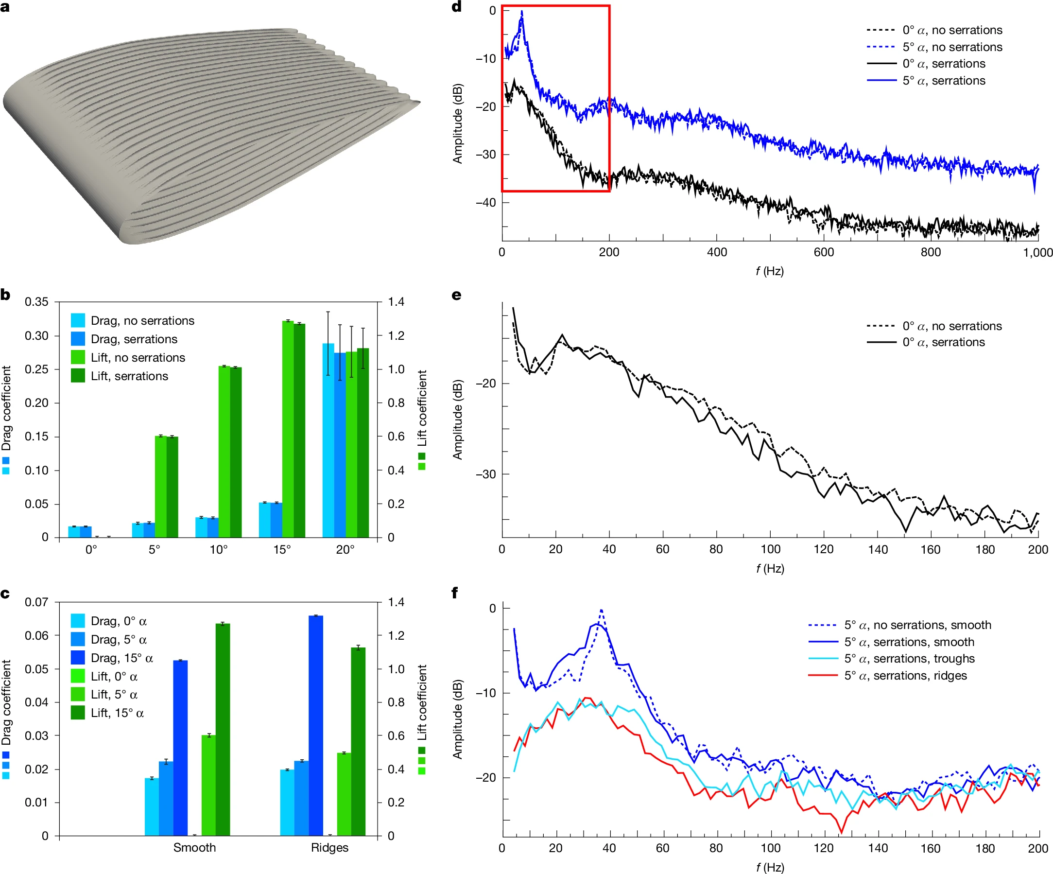 Во-первых, зазубрины снижают уровень шума (особенно на частотах ниже 200 герц, наиболее значимых для подводной слышимости). Эффект особенно выражен при углах атаки 0–5 градусов, то есть когда животное скользило через воду, не совершая резких манёвров. Уменьшение достигало 1–3 дБ — немного, но при большом расстоянии и хорошей чувствительности рецепторов у потенциальной добычи — весьма ощутимо.