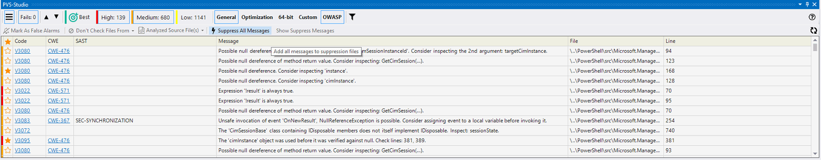 После нажатия анализатор запишет все срабатывания в основной suppress-файл проекта, при этом они пропадут из окна просмотра отчёта.