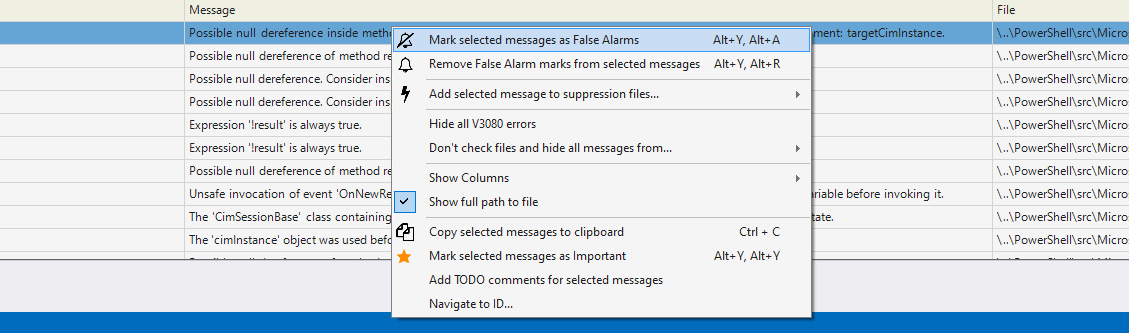 Вариант с расстановкой комментариев в исходном коде вручную может быть не самым удобным, поэтому плагины PVS-Studio для интегрированных сред разработки позволяют упростить этот процесс до нажатия всего одной кнопки Mark selected messages as False Alarms в контекстном меню: