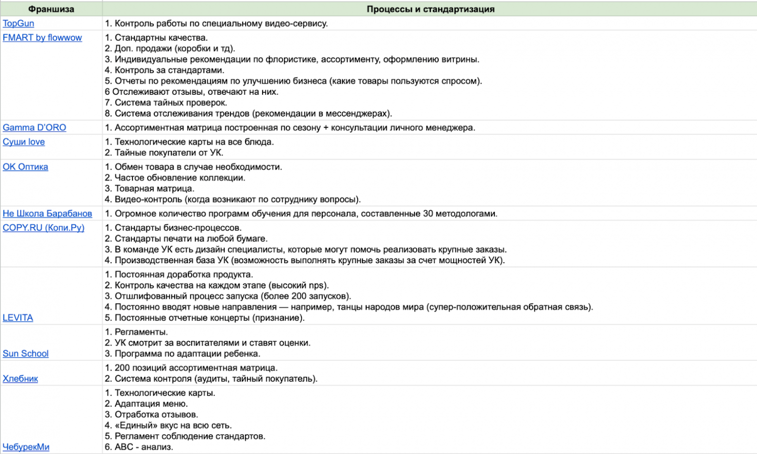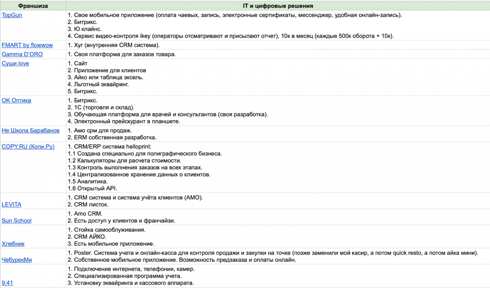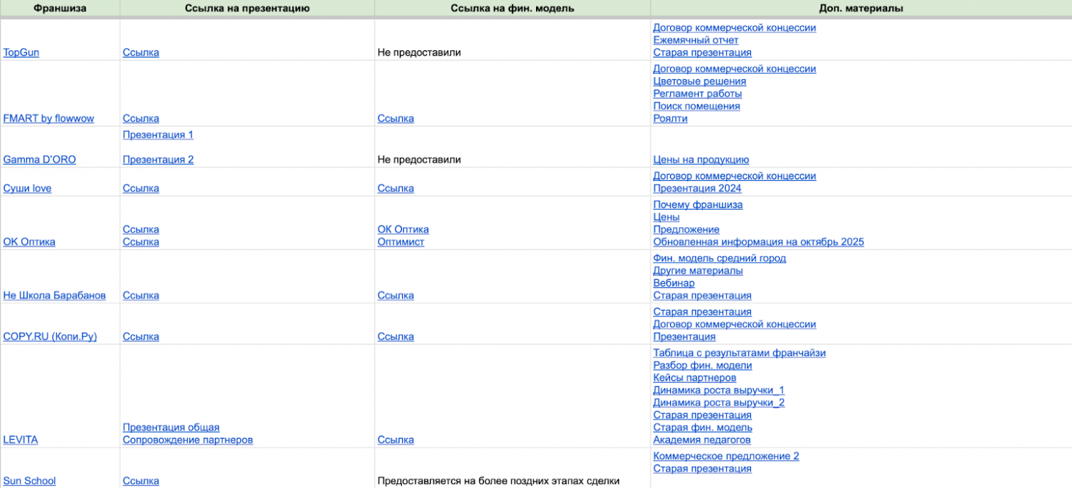 Для этого гайда я оставил 15 заявок и сделал максимально широкую выборку. Такой подход дает общий взгляд на рынок, но без глубоких инсайтов по конкретной нише. В список попали лидеры — франшизы, которые на слуху в своих сферах. Это дает объективное понимание, как выглядит рынок в целом.