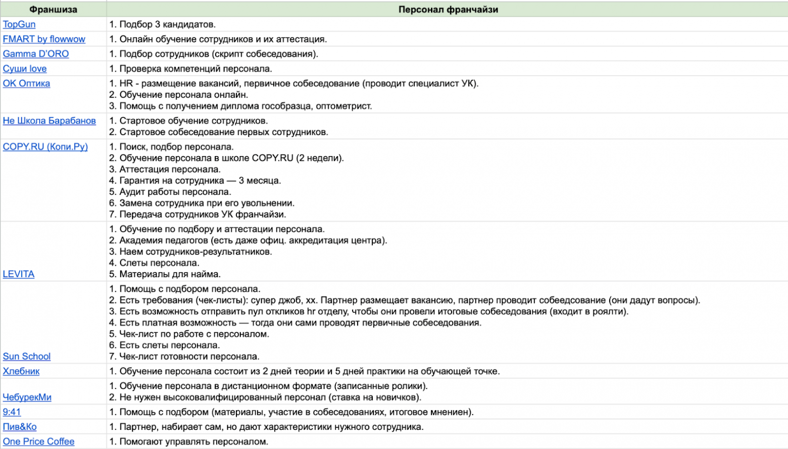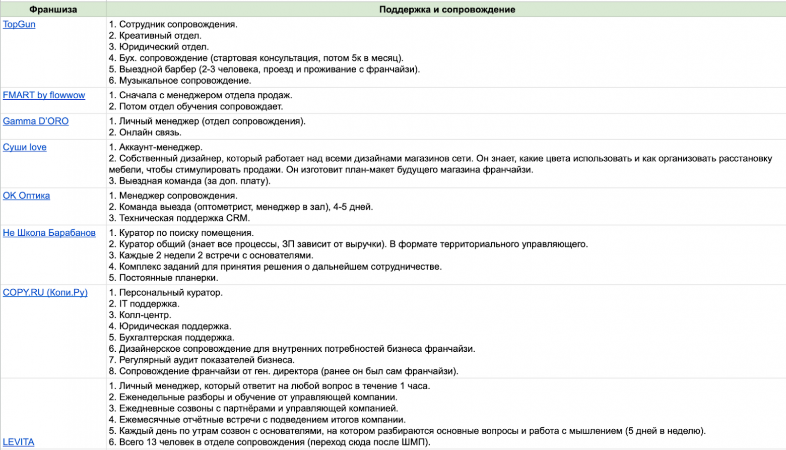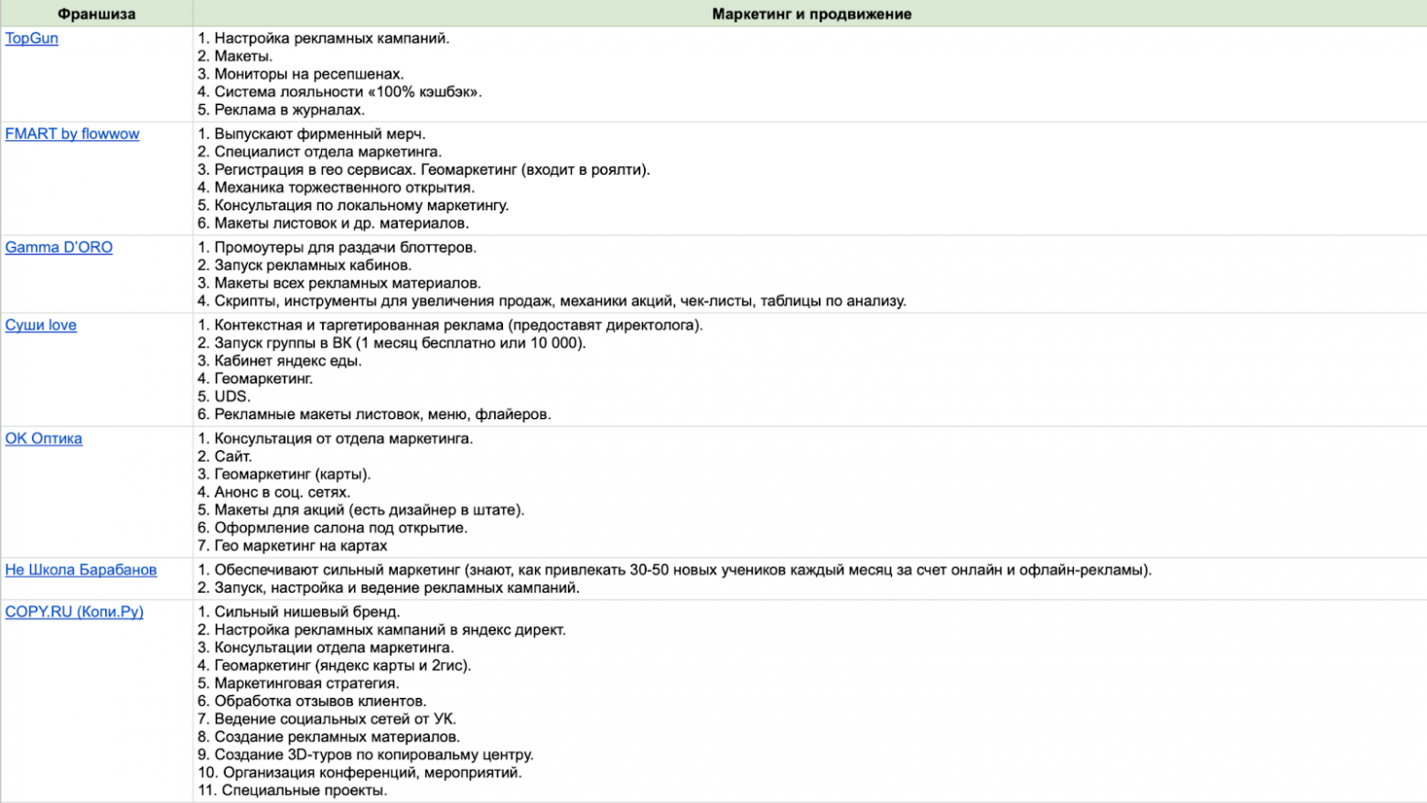 Для этого гайда я оставил 15 заявок и сделал максимально широкую выборку. Такой подход дает общий взгляд на рынок, но без глубоких инсайтов по конкретной нише. В список попали лидеры — франшизы, которые на слуху в своих сферах. Это дает объективное понимание, как выглядит рынок в целом.