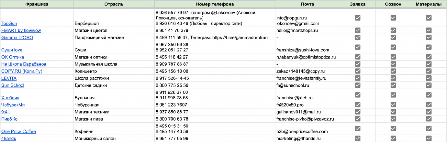 Я зафиксировал, кто перезванивал и проявлял активность. В основном это были МОПы — неудивительно, ведь в выборке были известные франшизы.
