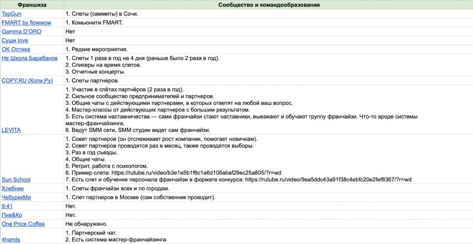 В таблице ниже я собрал основные отзывы на франшизы из выборки: