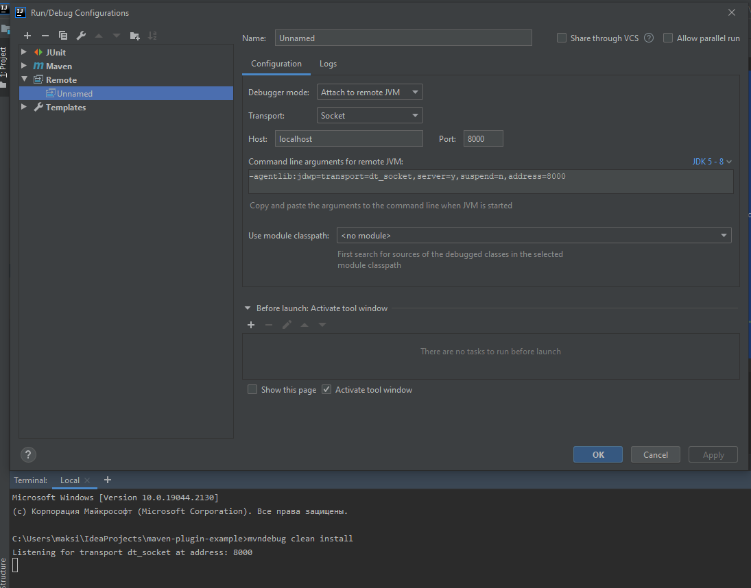 mvnDebug будет ждать пока мы включим debug соединение в idea и после этого запустит процесс сборки.