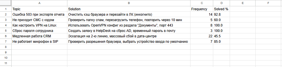 Google Sheets в роли хранилища знаний — хранит тему, решение, частоту и долю решенных обращений. Удобно для MVP и быстрого анализа данных