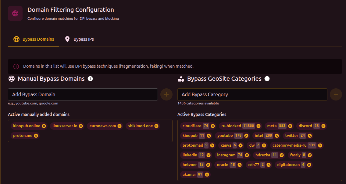 B4 устанавливается одной командой, настраивается через веб-интерфейс и умеет автоматически подбирать рабочую стратегию обхода для конкретной сети. Поддерживает geodata-базы (v2ray/xray) - вместо ручного добавления сотен доменов/ip/asn можно подключить условные категории youtube или facebook и получить актуальный список, который обновляется вместе с базой.