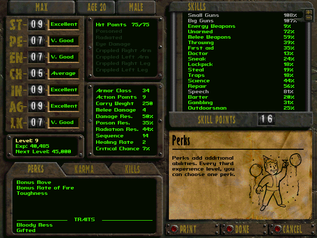 А конкретно для списка перков и скиллов Fallout 1 и 2 использовался Gothic 821 Condensed. Вот так он выглядел. Он очень крутой.