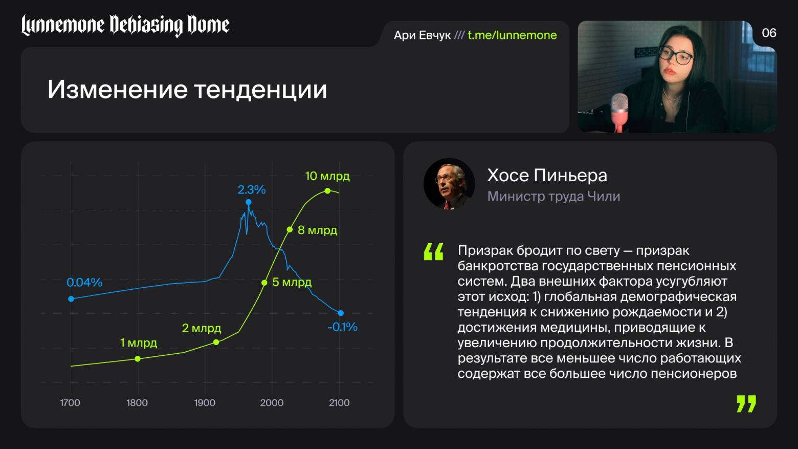 Понимая эти печальные тенденции, министр труда Чили как-то сказал: «Призрак бродит по свету — призрак банкротства государственных пенсионных систем. Два внешних фактора усугубляют этот исход: глобальная демографическая тенденция к снижению рождаемости и достижения медицины, приводящие к увеличению продолжительности жизни. В результате всё меньшее число работающих содержат всё большее число пенсионеров».