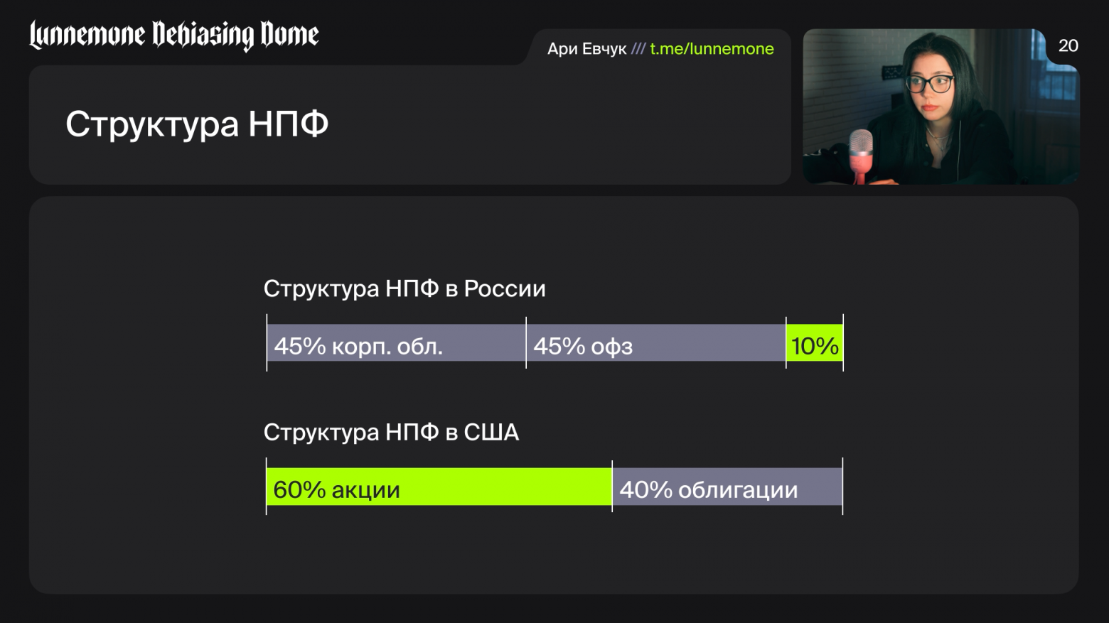 Почему так получается? Если посмотреть на структуру инвестиций НПФ, то мы увидим, что в России отдают предпочтение консервативным инструментам. Государственным и корпоративным облигациям. Это инструменты с фиксированным доходом, у них низкий риск и низкая доходность. И это, на мой взгляд, большое упущение, ведь пенсионные портфели — это именно про очень долгосрочные инвестиции, и можно было увеличить долю рискованных активов, акций, для получения более высокой доходности, как это делают пенсионные фонды в США.