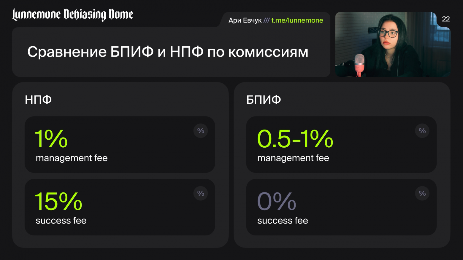 И усугубляется это всё высокими комиссиями. Комиссия НПФ состоит из двух частей: комиссия за управление, она берётся от всего капитала независимо от результата, и комиссия за результат, берётся, соответственно, от результата. В среднем у нас по рынку комиссия за управление составляет 1% и плюс 15% за результат. И это очень высокие комиссии. Я бы даже сказала, это почти что грабеж.