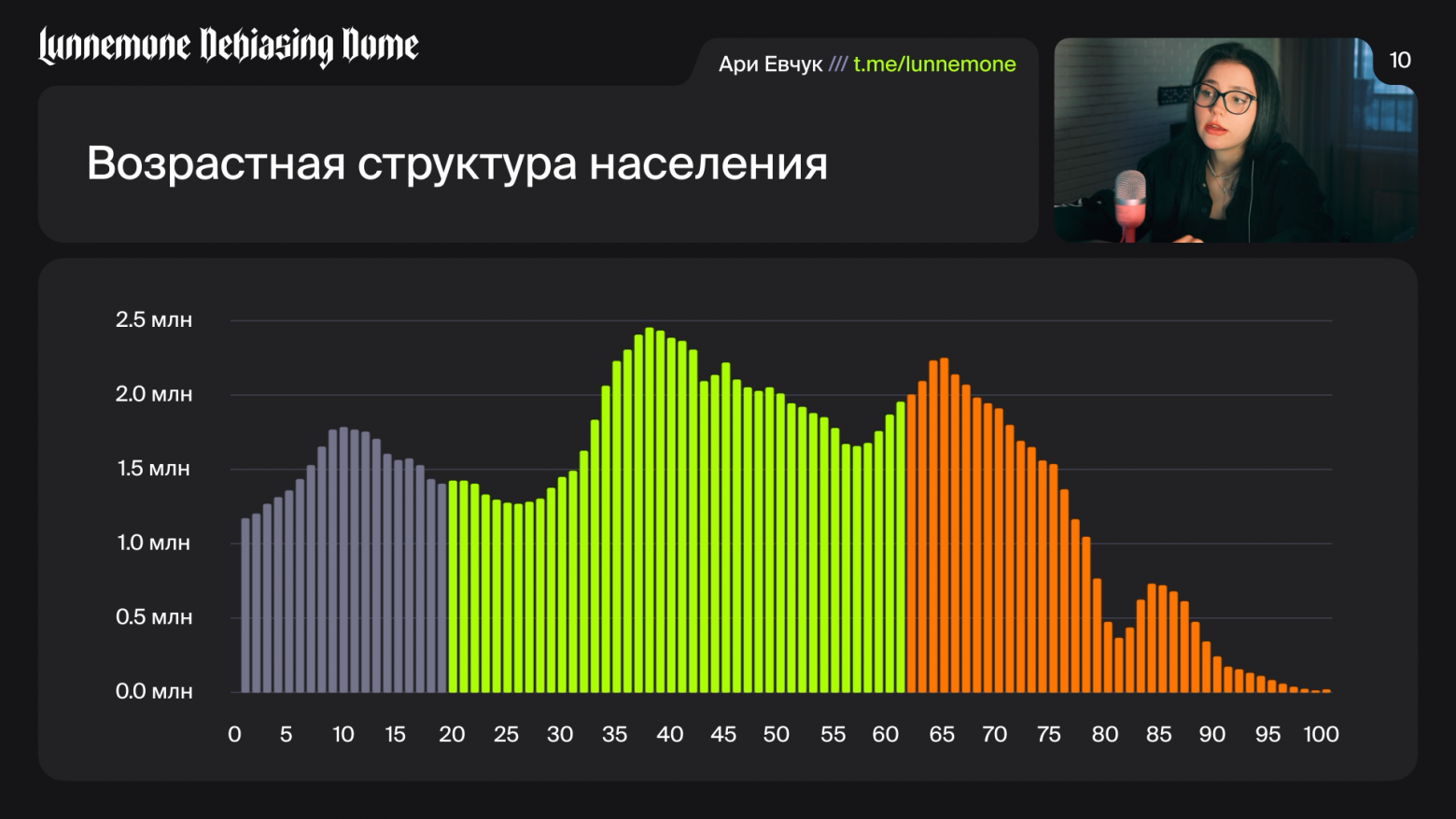 Еще важно посмотреть на возрастную структуру населения. Зеленым отмечен трудоспособный возраст, а оранжевым — пенсионный возраст. Как видно на графике, пока что пенсионеров меньше, чем работающих. Но посмотрите на серые столбцы. Это все подрастающие дети, и тут хорошо видно, что их мало. Рождаемость падает.