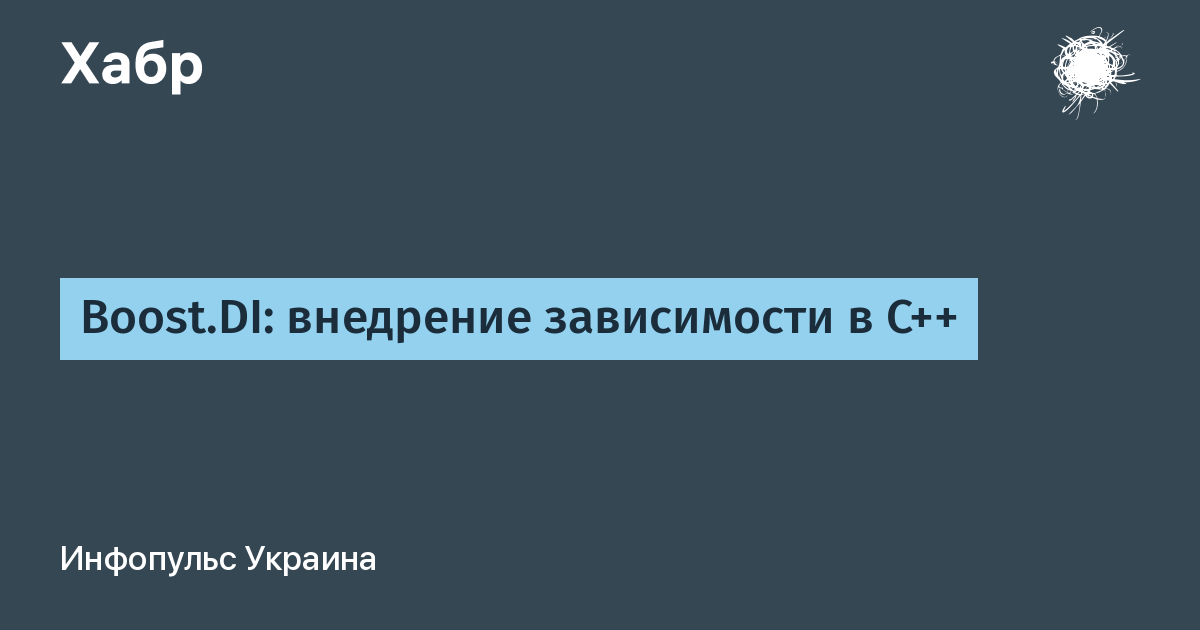 Boost.DI это библиотека для реализации внедрения зависимости в С++. Для её использования нужно лишь включить в свой код один заголовочный файл. Цель библиотеки — упростить создание объектов с помощью автоматического внедрения зависимостей: