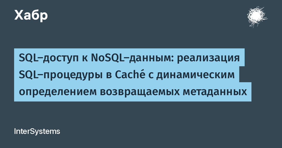 Однако в стандартной библиотеке классов Caché существует одно ограничение: для SQL-процедур, в которых отбор выполняется самописным COS-кодом, необходимо определять набор возвращаемых полей на этапе компиляции — т.е. нет возможности динамически задать метаданные для SQL-процедуры, работающей с NoSQL структурами.