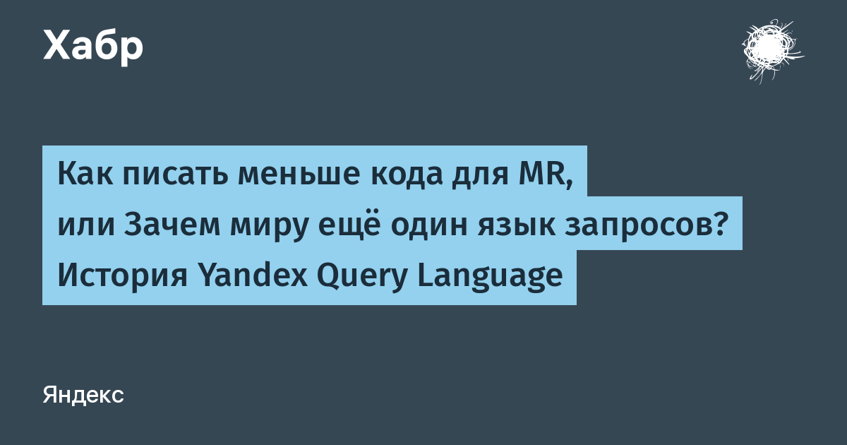 SQL over ***»: в первую очередь нас интересовала именно поддержка активно используемых в Яндекс систем. Хотелось упростить миграции проектов, то есть все компоненты из диаграммы в начале поста все равно пришлось бы разрабатывать и/или дорабатывать. При этом нужно было бы подстраиваться под устои open source-сообщества. Кроме того, были бы трудности с тем, что Java-разработчиков в Яндексе примерно на порядок меньше, чем C++-разработчиков, а люди с опытом разработки ядра этих open source-проектов — дефицит даже в США. И в результате совершенно не факт, что получилось бы лучше или быстрее. YQL создан с нуля где-то за год командой примерно из 10 человек, большинство из которых участвовали не full time. - Сконцентрировавшись исключительно на SQL-диалекте, мы бы закрыли двери перед заметным классом людей, которым удобнее описывать макропреобразования данных и бизнес-логику однородным образом на одном языке программирования. В Яндексе уже существовала библиотека такого класса для Python под названием Nile: мы вместо имевшегося в ней runtime реализовали (за ее публичным API) генерацию и запуск YQL-запросов на s-expressions. Сейчас мы находимся в процессе доработок для переключения на него по умолчанию. Другие языки программирования, где такой интерфейс был бы востребован, в Яндексе гораздо менее распространены, но в будущем не исключено появление аналогов и для, например, Java.