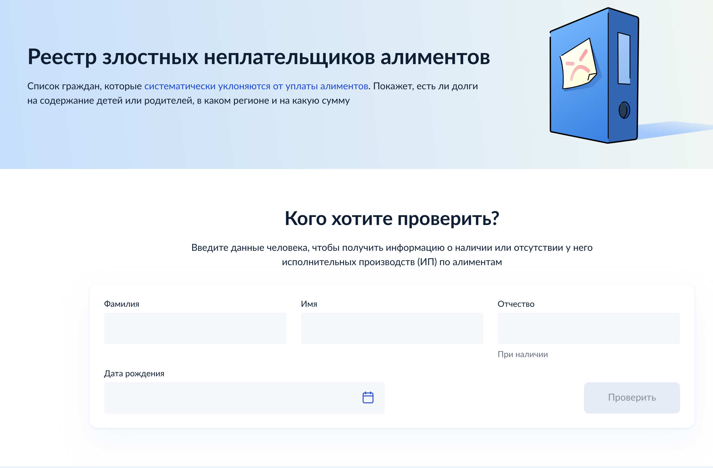 Для проверки понадобятся только базовые данные. Нужно ввести фамилию, имя, отчество и дату рождения человека. Авторизация на портале не требуется. Данные документов для поиска также не нужны.