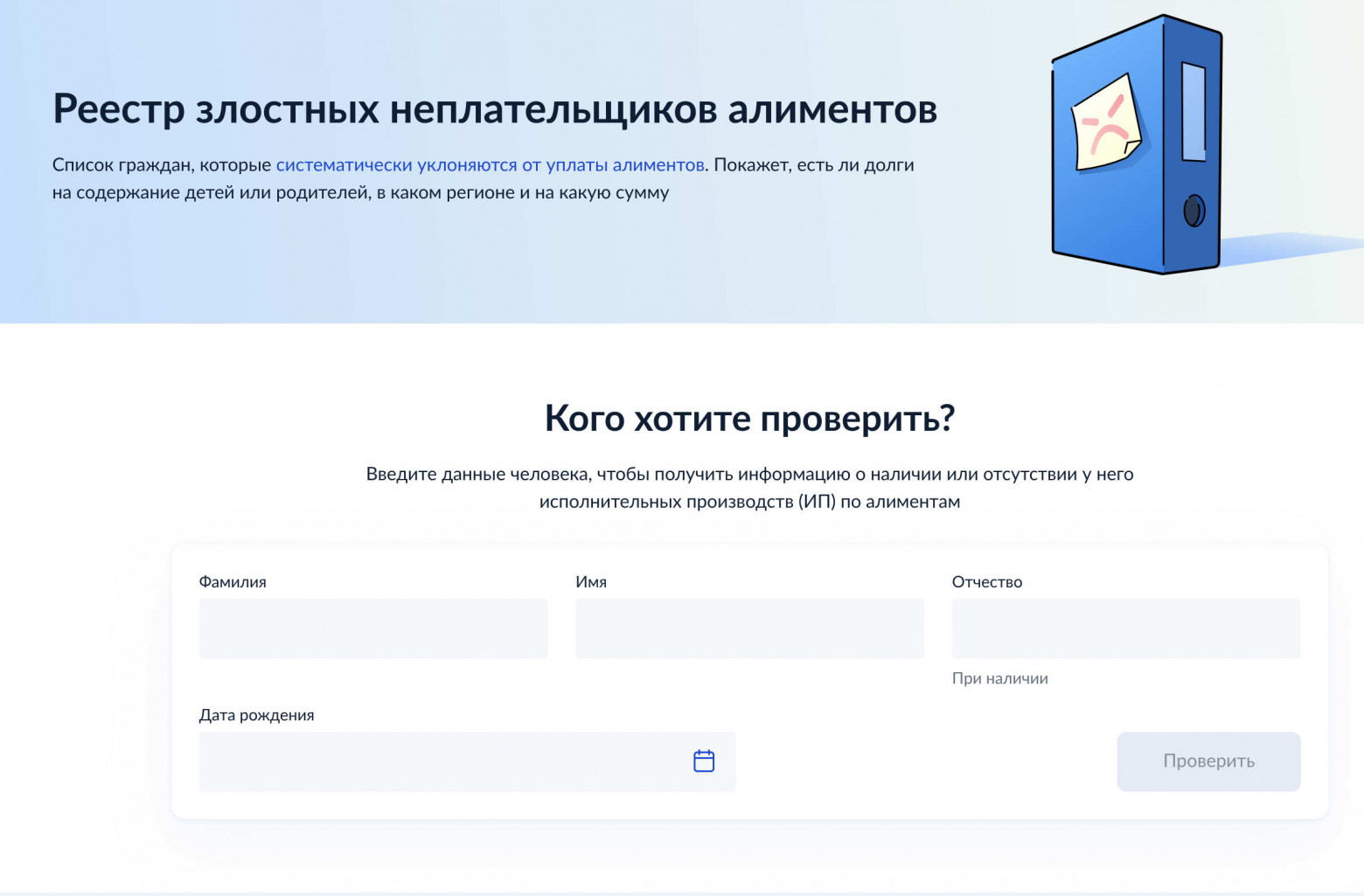 Минцифры РФ рассказало, что на портале «Госуслуги» появился реестр злостных неплательщиков алиментов. В новом сервисе любой пользователь может узнать, есть ли у человека долги по алиментам на содержание детей или родителей. В реестре также указывается регион и сумма задолженности.