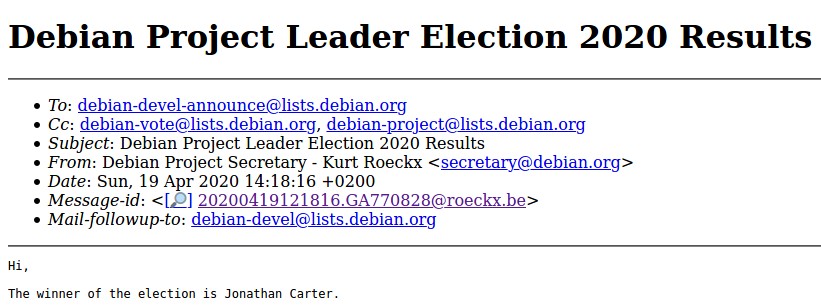 19 апреля 2020 года секретариат сообщества разработчиков Debian подвел итоги голосования DPL 2020 (Debian Project Leader). Новый лидером проекта Debian стал 38-летний "старый хакер" и разработчик Джонатан Картер (aka highvoltage) из Кейптауна, Южная Африка. Картер также принимал участие в DPL 2019, но там ему досталось только третье место.