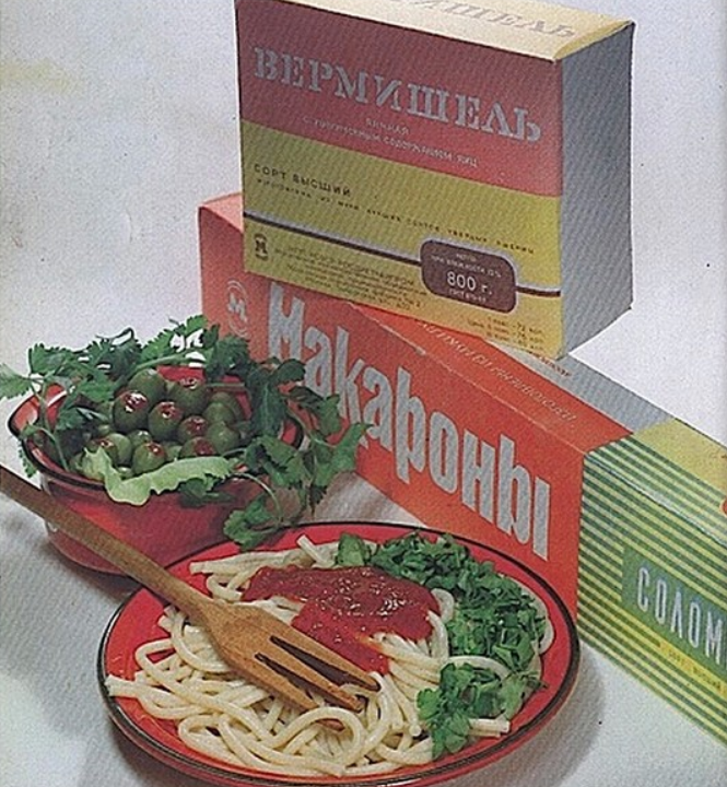 В начале 70-х годов СССР становится второй после Италии страной по объёмам производства макаронных изделий — и это несмотря на то, что в США они тоже весьма популярны. Потребление на душу населения оценивалось Большой советской энциклопедией 1970-х годов в 5,2 кг сухих макарон на человека в год. Они делились на высший и первый сорт, а также на три группы: А — лучшие, из чисто твёрдых сортов пшеницы, Б — из смеси, и В — сугубо из мягких хлебных сортов. Само собой, А высшего сорта были желанными, но дефицитными, а более распространённые имели прискорбную склонность к склеиванию и развариванию. Что вызывало необходимость в промывании для удаления избытков клейкого крахмала, и усугублялось привычкой люто переваривать макароны по сравнению с итальянской кухней. И всё же макароны любили и ели часто.