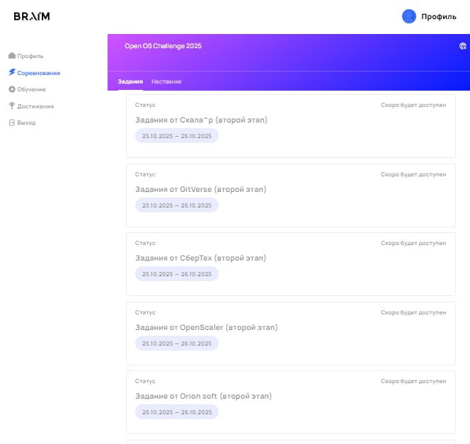Первый этап (теоретический) 15.09.2025 — 19.10.2025: участники должны были пройти онлайн‑тестирование в формате «вопрос — несколько вариантов ответов». Протокол «Open OS Challenge 2025» «Итоги первого отборочного этапа».