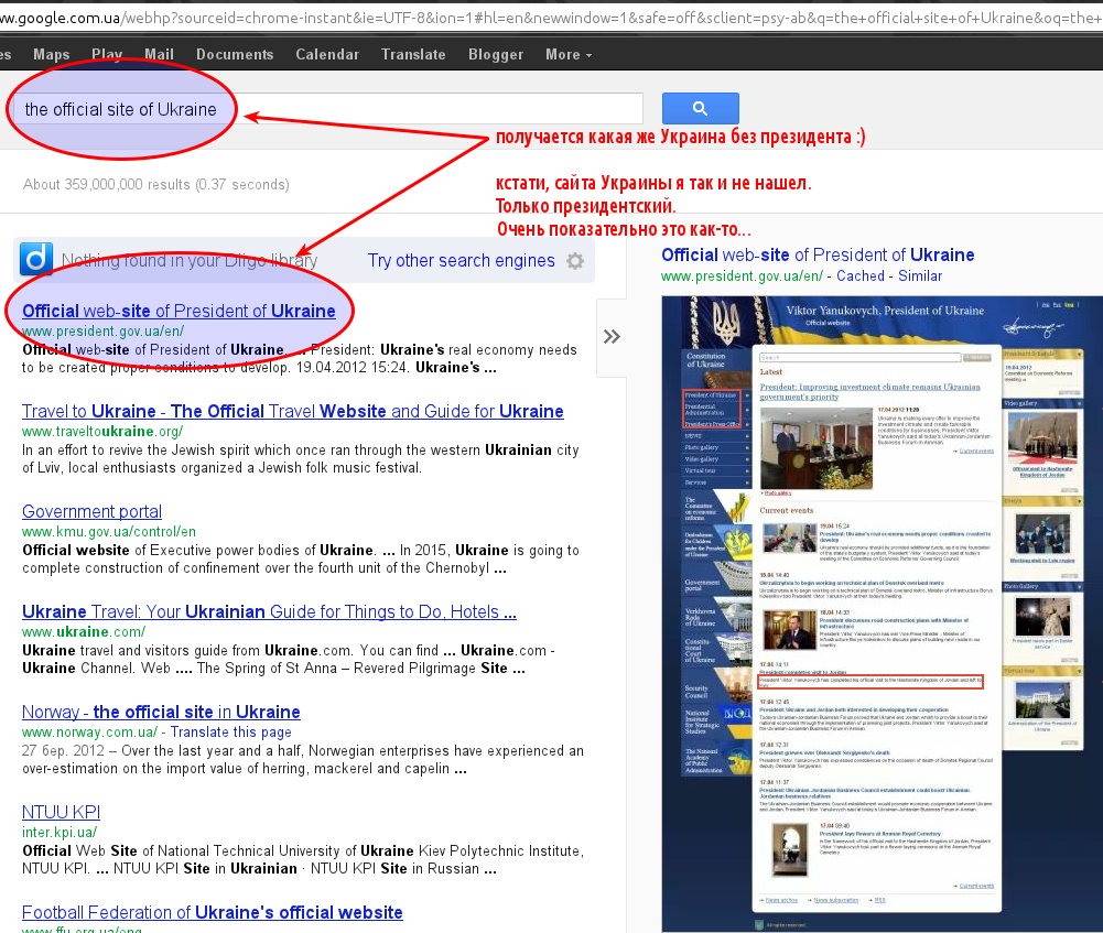 Ну я вот тут goo.gl/Myuev тоже попытался поискать официальный сайт Украины. В общем, нашел только президента… goo.gl/KGGMF, что показательно: какая ж Украина без президента? :)
